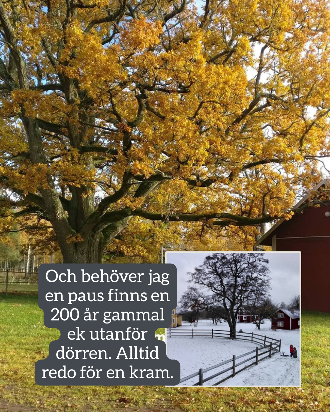 Och behöver vi en paus från arbetet är det bara att öppna dörren. Insupa det småländska landskapet. Låta blicken vila på Per Brahe ruinen på andra sidan sjön. Eller gå till den stora 200 år gamla eken som står mitt på gården. Trygg och stabil och alltid redo för en grundande kram.