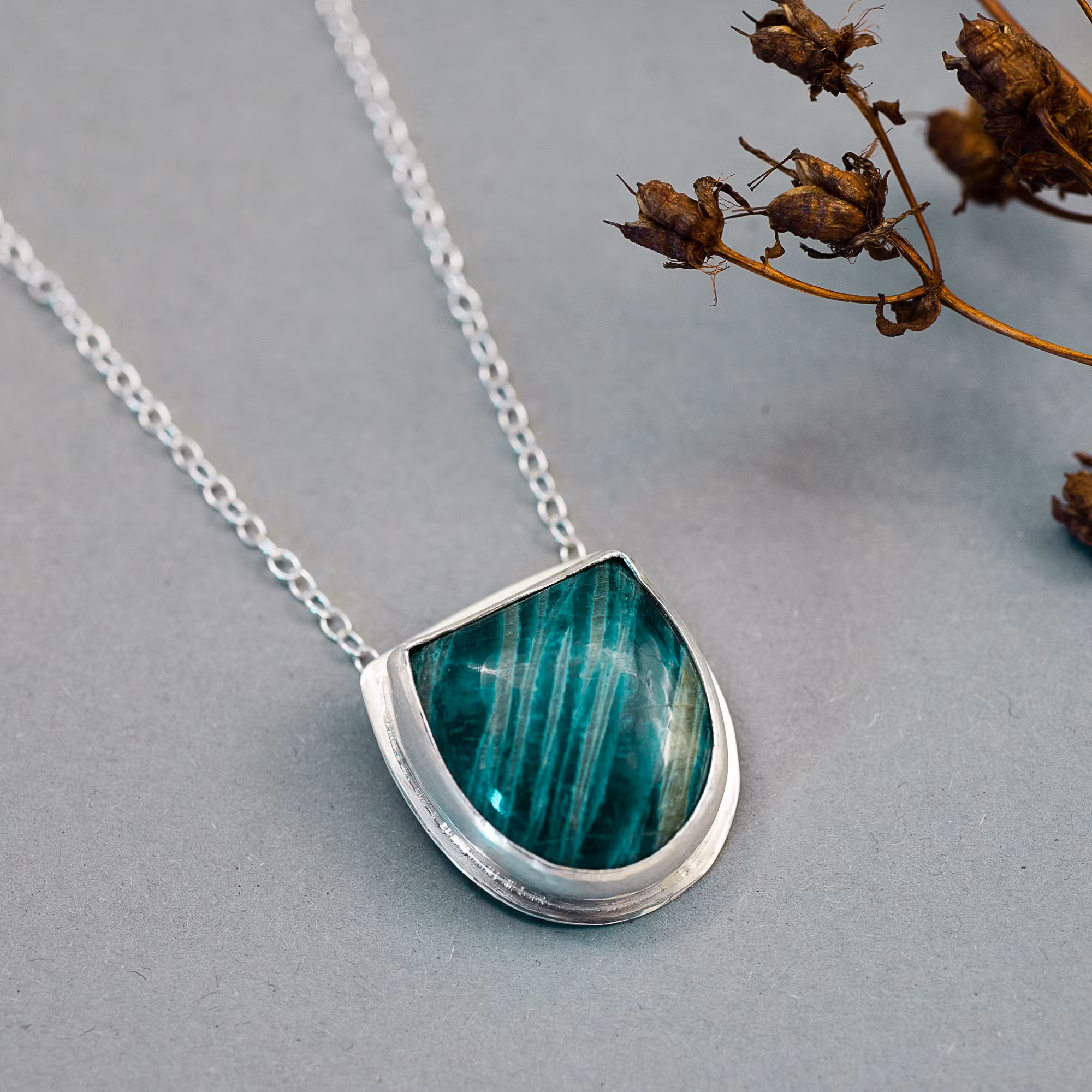 Vacker giftgrön amzonit i sterling silver som hänger i en lång kedja som är justerbar mellan 75 och 80 cm. Hänget mäter 24x21 mm.