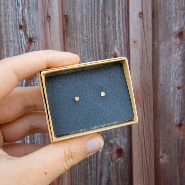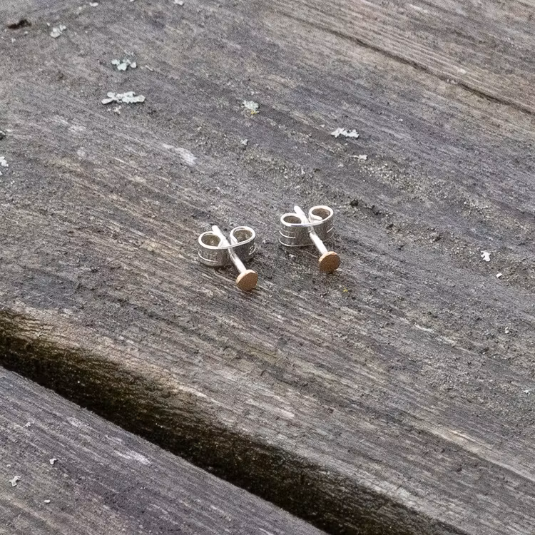 Små söta örhängen i 18 k rödguld och silver med borstad matt yta.18 k återvunnet rödguld på plutten. Återvunnet Sterling Silver pinne och bakplutt.ca 2,7 mm i d
